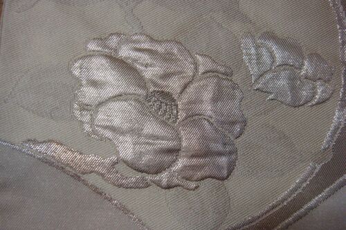 ~小紋に椿の袋帯 寒さに耐えて凛と咲く椿に心惹かれる方も多いと思います。 白地に、銀糸で扇面を。 その扇の中に、ピンクがかった?ブルーがかった?オーロラのような椿が織り込まれている袋帯です。 この帯の色合いですと、どんな色の着物でも合わせやす…