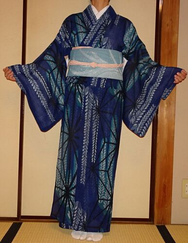 私はランチだけのバイトなので、帰りが一番日差しの強い時間帯になります。 黒っぽい着物は、光を集めて、より暑く感じます。 でも、藍色や、黒い地色の着物を着たい日もあります。 濃いブルー地に大きな藤の花房と麻の葉が染められている着物です。 これも…