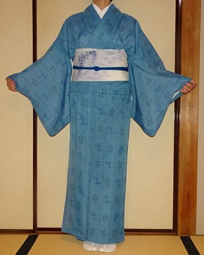 7月の着物コーデ 夏は、大事なお出かけ以外は、洗える着物にしています。 絹の方が、だんぜん涼しいのですが、汗染みとか、、、お手入れが大変です。 織柄をプリントしてある着物です。 紗もどきですね。 織の着物には、染めの帯というのが定番です。 この帯…