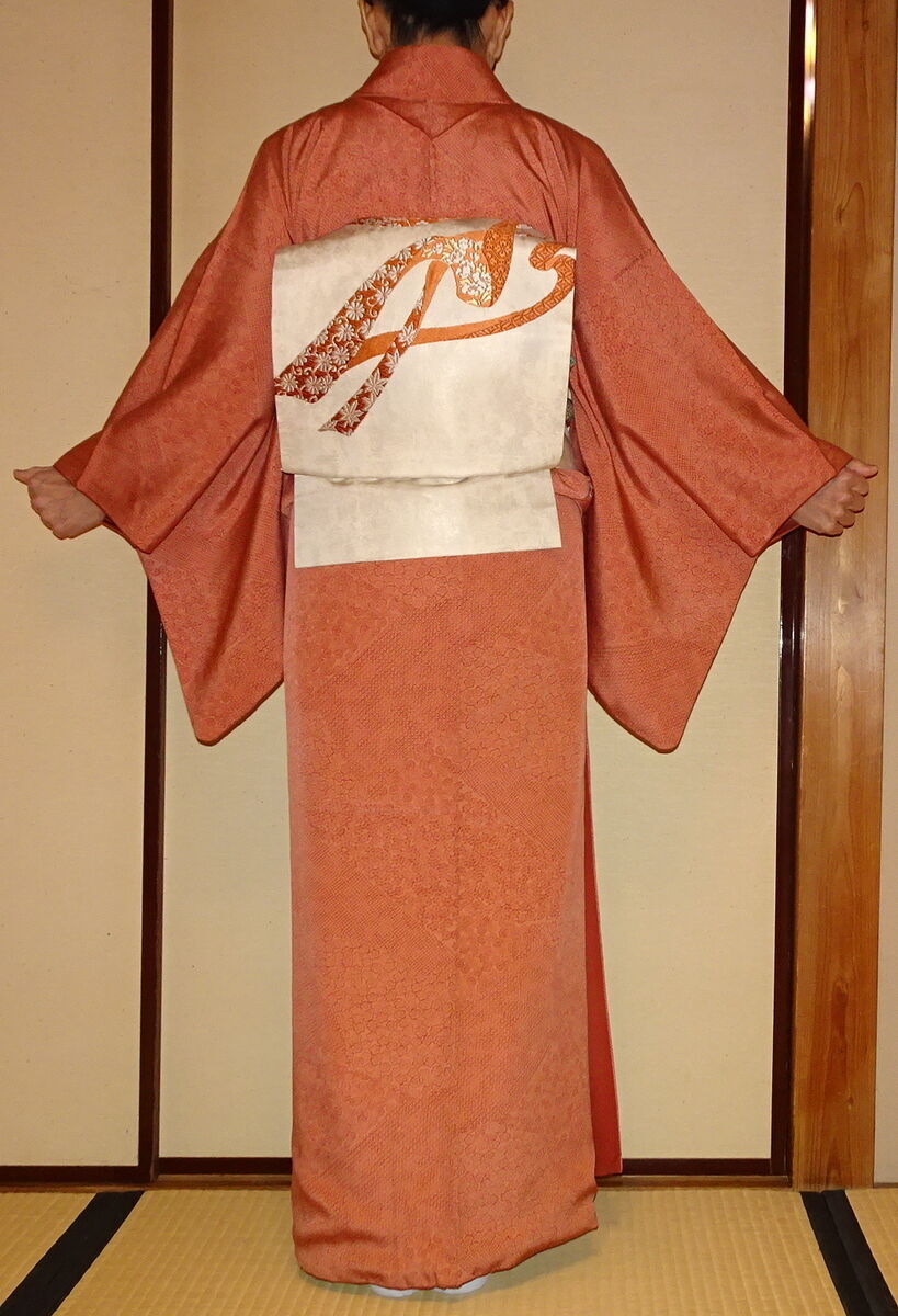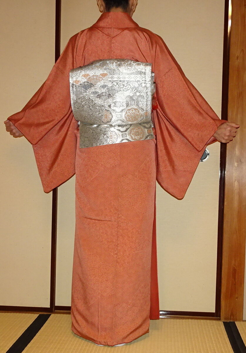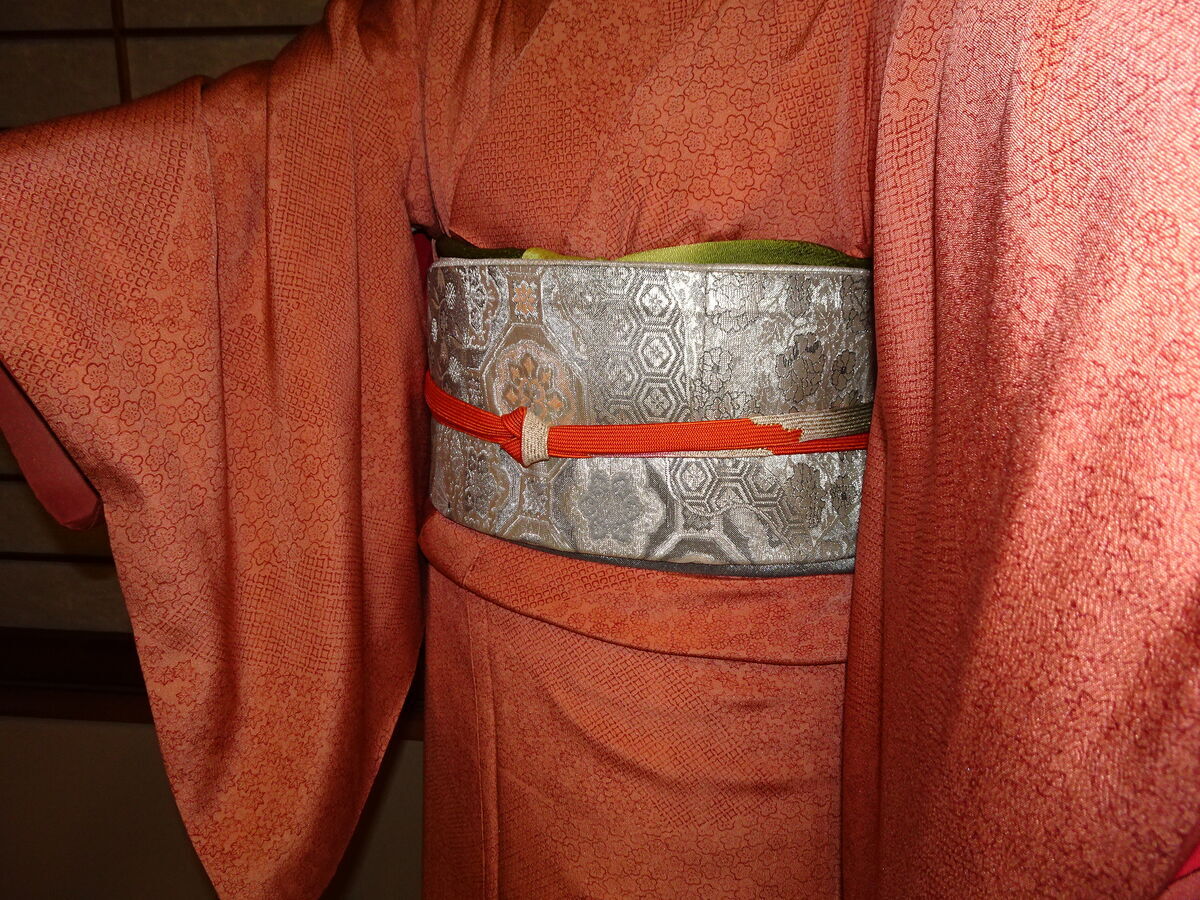 銀の帯は比較的どれにも合わせやすいのですが、この帯にはオレンジも使われているので、着物の地色と引き合うと思い選びました。