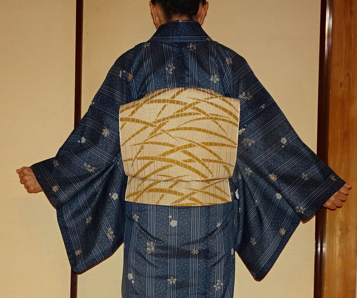 この着物を7月に着る場合は、白っぽい帯を合せた方が良いかと思います。