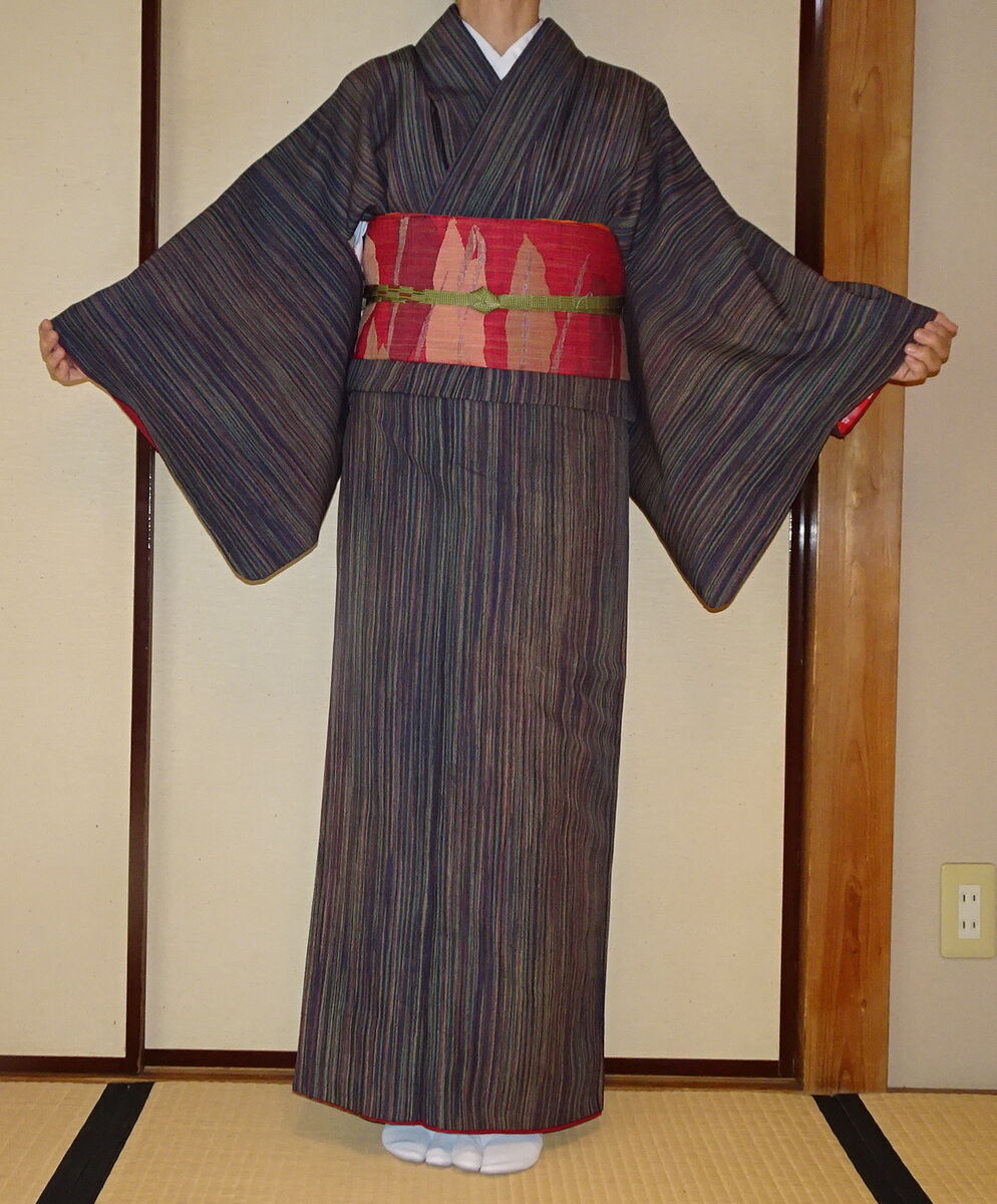 渋めの着物でも、赤い帯を合せれば、老け込みません。