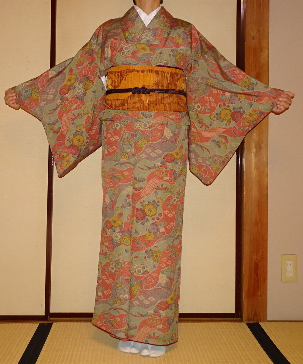 この着物、よく見ると、グリーン、オレンジ、紫など、たくさんの色が使われています。